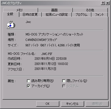また 以下の画像でコマンドラインのところが D:\JWC.BAT になっていますがこれは私の環境が