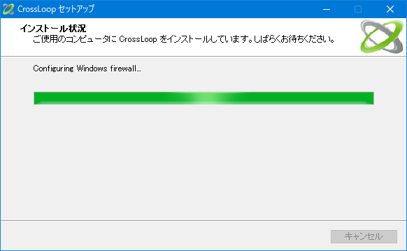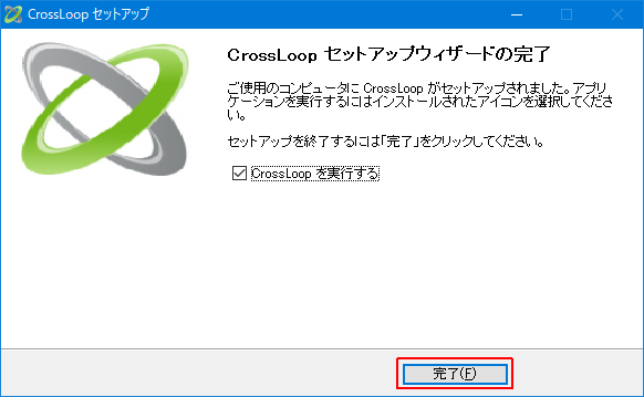 (8) しばらくすると CrossLoop セットアップウイザードの完了 になるので [ 完了 ] をクリックする。