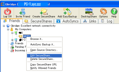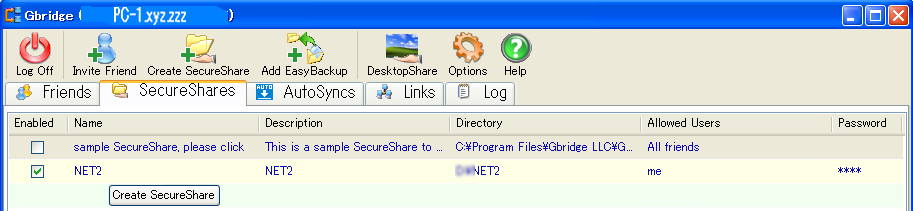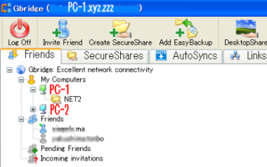 Friendsタブ をクリックすると共有したフォルダ( NET2 )が表示される。
