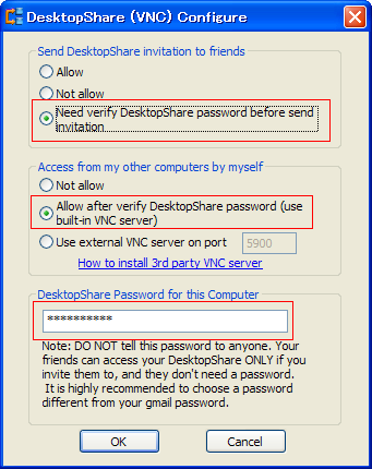 ○ Not allow にチェックを入れる。 - DesktopShare Password for this Computer で