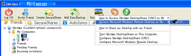--> Configure Gbridge Desktop Share(VNC) をクリックする。 - Send DesktopShare invitation to friends で