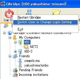 このとき Gbridgeが使用している ローカルエリア接続の切断 がポップアップ表示されます。 - 違うGmailアカウントでログインしたい場合は