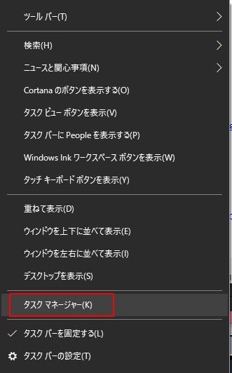 - タスクバーを右クリックしてタスクマネージャを左クリックする。