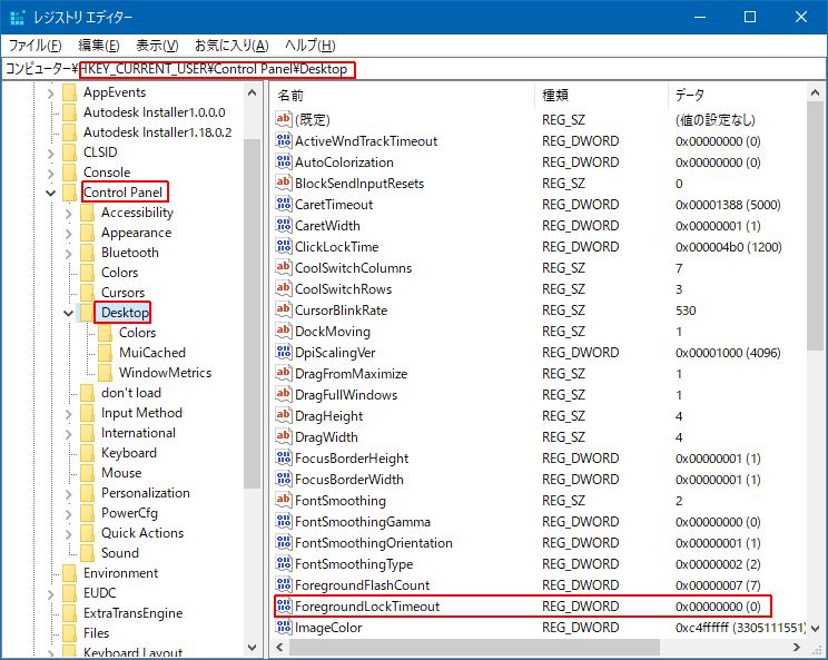 - HKEY_CURRENT_USER \ Control Panel\Desktop にある ForegroundLockTimeout を開きます。