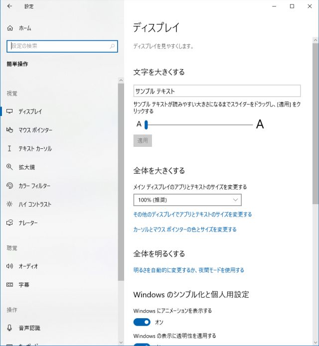 Windows の設定 → 簡単操作 → ディスプレイにある