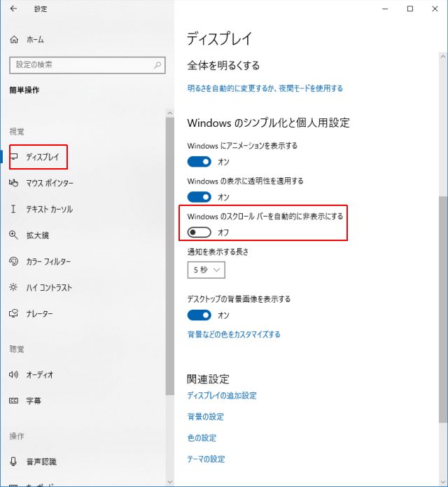- 右側のスクロールバーを下の方にスクロールすると Windows のスクロールバーを自動的に非表示にする を