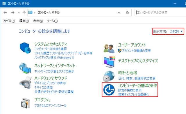 - コントロールパネルが開きます。(右上の表示方法がカテゴリ選択の場合)