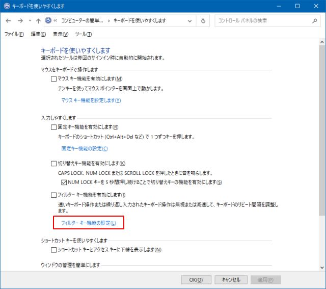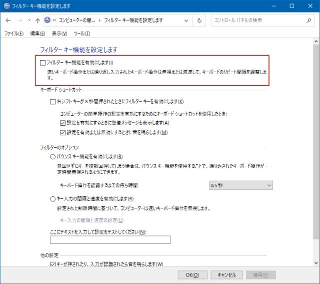 入力しやすくします項目にある フィルター キー機能を有効にします。