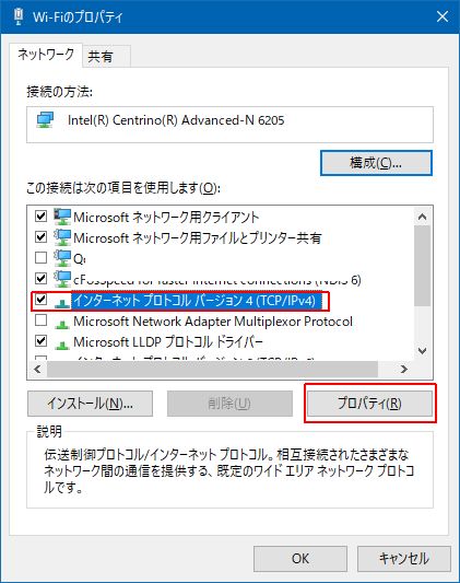 [インターネットプロトコル バージョン 4 (TCP/IPv4)] を選択して [プロパティ] をクリックします。