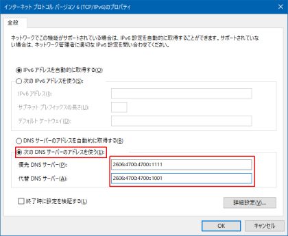 注意点として、インターネット接続が IPv4 環境下で、PC の DNS 設定を Cloudflare の 1.1.1.1、1.0.0.1 にしていた場合、