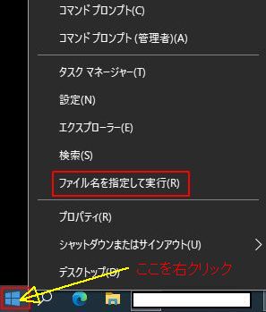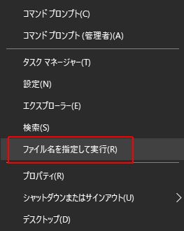 - 左下のスタートボタンを右クリックしてファイル名を指定して実行をクリックする。