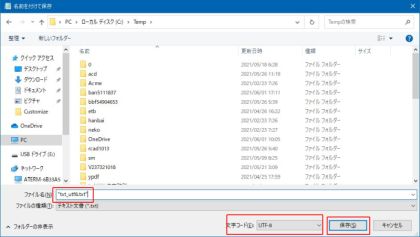 - 保存するファイルの種類を UTF-8 を選択して保存をクリックする。