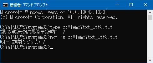 コマンドプロンプトからtypeコマンドで表示すると、以下のように文字化けします。