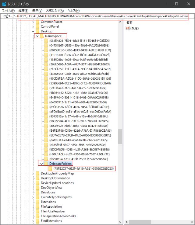 Explorer \ Desktop \ NameSpace \ DelegateFolders を開く。
