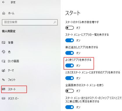 「スタート」にある「よく使うアプリ」の表示をオン/オフするだけでなく…