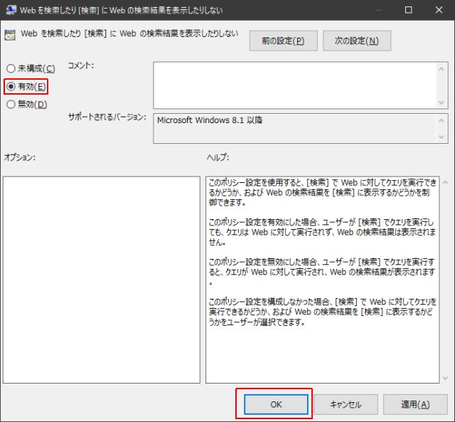 レジストリの編集で「Web検索のみを無効」にすることができます。