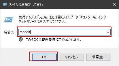 「ファイル名を指定して実行」が開きます。 - テキストボックスに「regedit」と入力し「OK」をクリックします。