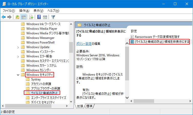 使用環境により、グループポリシー(Pro版)やレジストリの編集による Defender の無効化する。