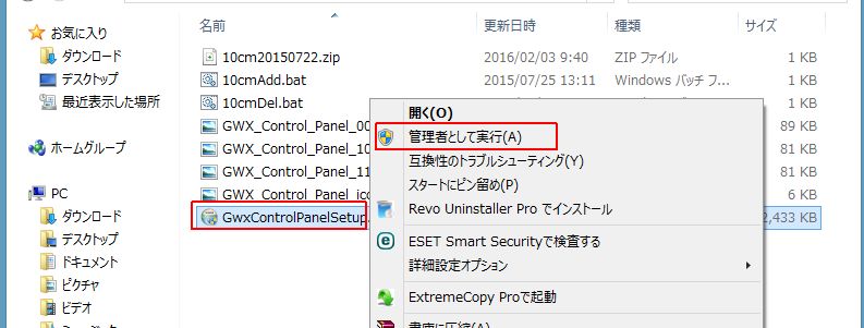 保存した GwxControlPanelSetup.exe を 右クリックして管理者として