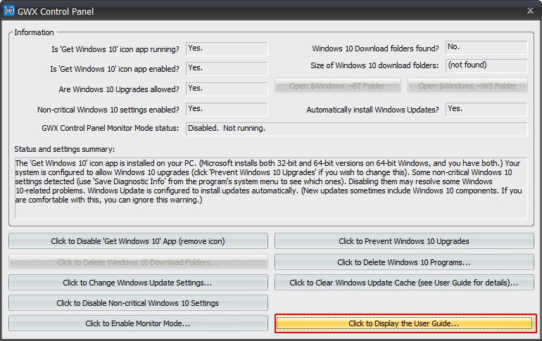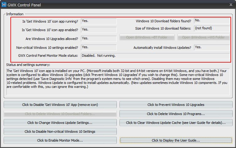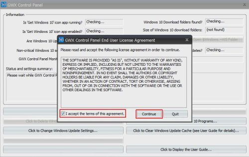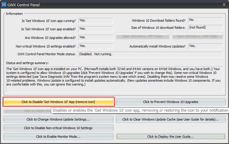 GWX Control Panelのウィンドウ画面。
