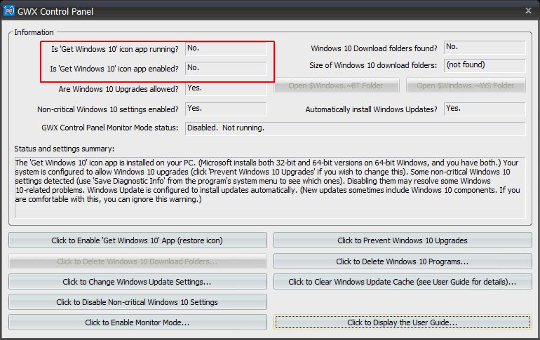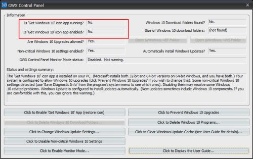 「GWX Control Panelのモニターモードが起動しているか」