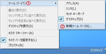 - 表示されたメニューのツールバー→新規ツールバーと選択します。