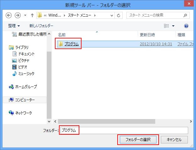 を選択し、フォルダ選択ボタンをクリックします。 - すると、タスクバーにプログラムと表示された部分が出現するので、