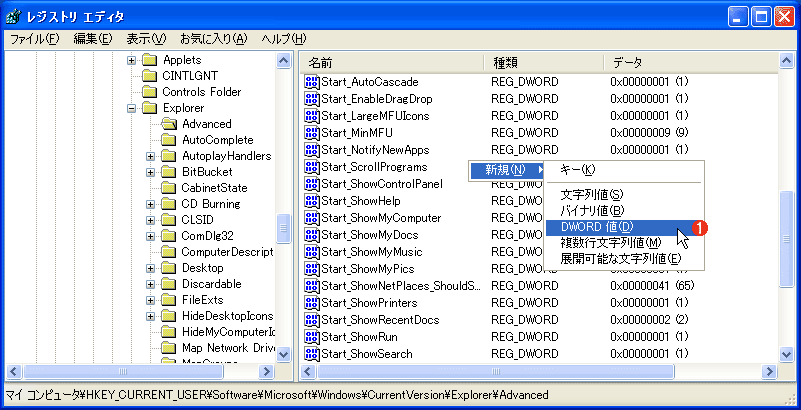 項目を新たに作成するには、マウスの右クリックで表示されるポップアップ・メニューの[新規]−[DWORD値]を実行し、