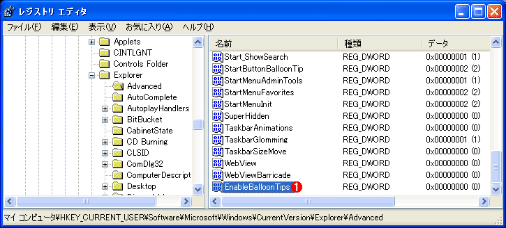 1. バルーン表示を禁止するには、レジストリ・エディタを起動して、次のサブ・キーに移動する。