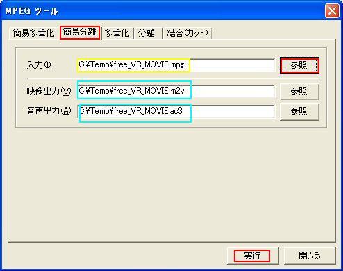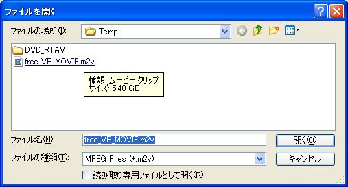 - CPRMを解除後拡張子を.mpgに変更したファイル(free_VR_MOVIE.mpg)を指定する。