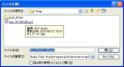 - TMPGEncで分離した free_VR_MOVIE.ac3 ファイルを開く。