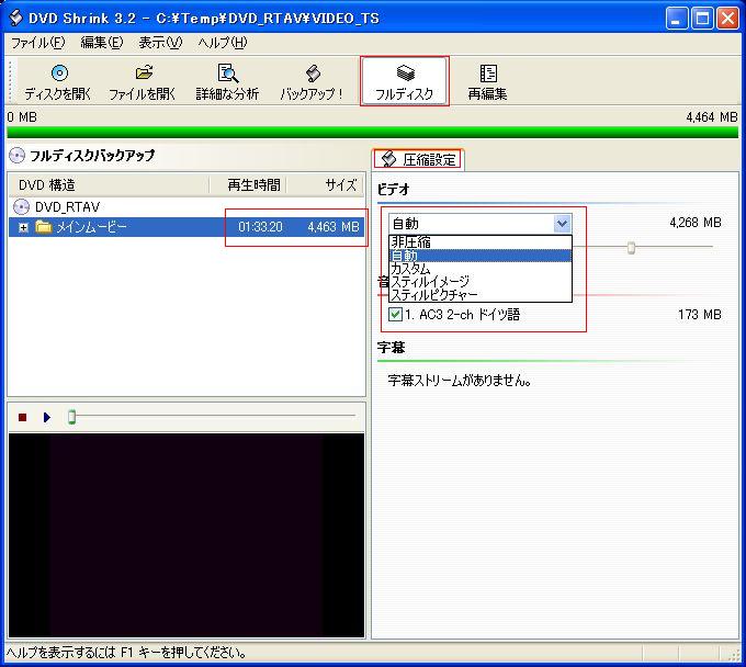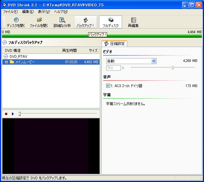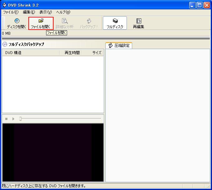 - DVD Shrinkを起動し、「ファイルを開く」をクリックする。